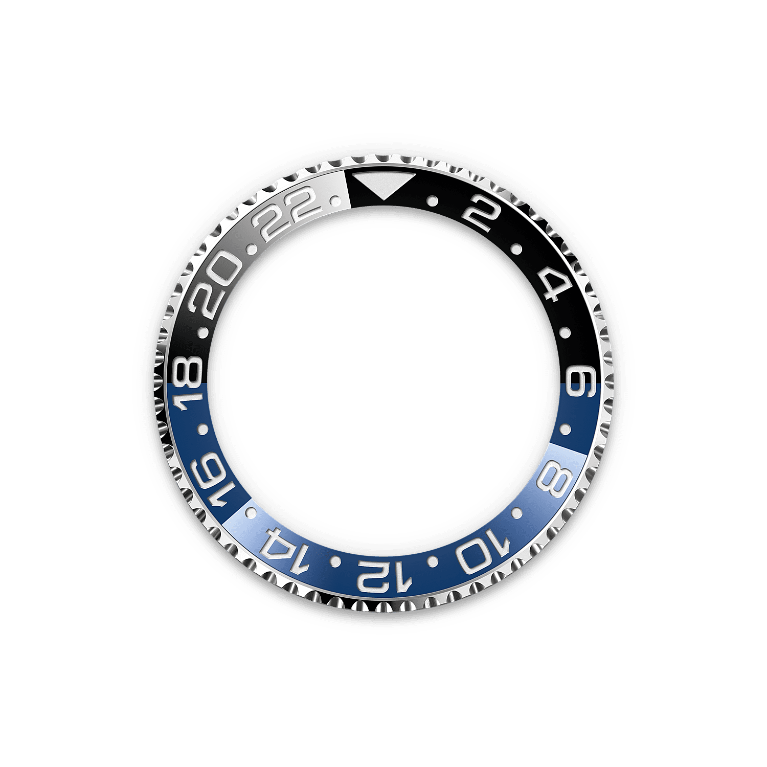 Bidirectional rotatable 24-hour graduated bezel. Two-colour blue and black Cerachrom insert in ceramic, moulded numerals and graduations